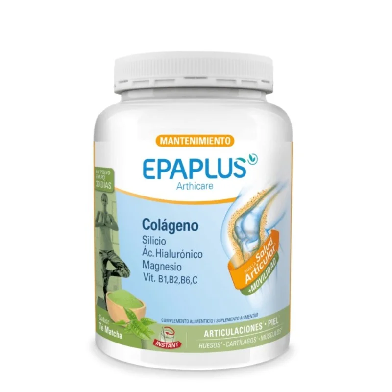 Epaplus Colágeno Antiox Articulaciones sabor te matcha es un complemento alimenticio que ayuda a la flexibilidad y movilidad articular por su contenido en colágeno hidrolizado, silicio (del extracto de bambú), ácido hialurónico, magnesio, vitamina C, vitamina E y vitaminas B1, B2 y B6.