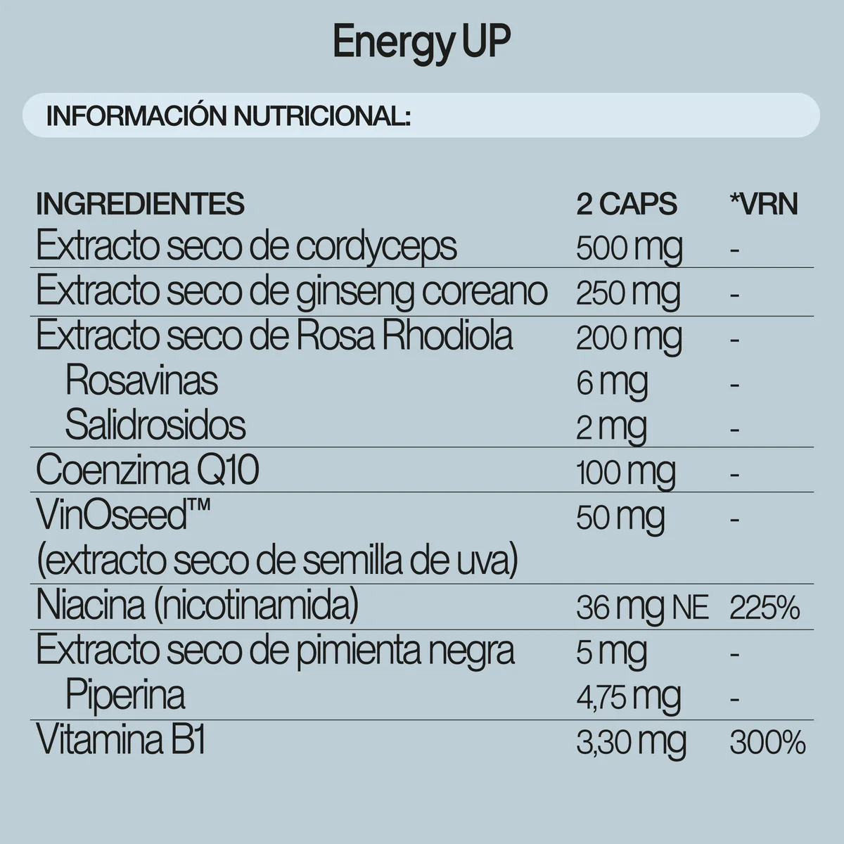 Fórmula avanzada que combina micronutrientes esenciales para el bienestar diario. Contiene Vitamina B3 (Niacina), que ayuda a disminuir el cansancio y la fatiga, y Vitamina B1 (Tiamina), que contribuye al metabolismo energético normal. Su fórmula se completa con una selección de ingredientes botánicos como el ginseng, rhodiola, coenzima Q10 y cordyceps.