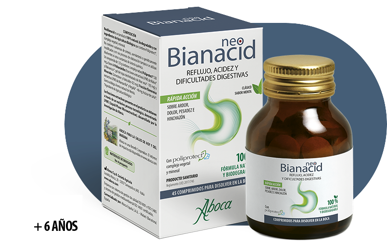 Neo Bianacid es un producto sanitario natural (Clase IIa, marcado CE) desarrollado por Aboca para aliviar los síntomas de la acidez, reflujo gastroesofágico y dificultades digestivas como la dispepsia
